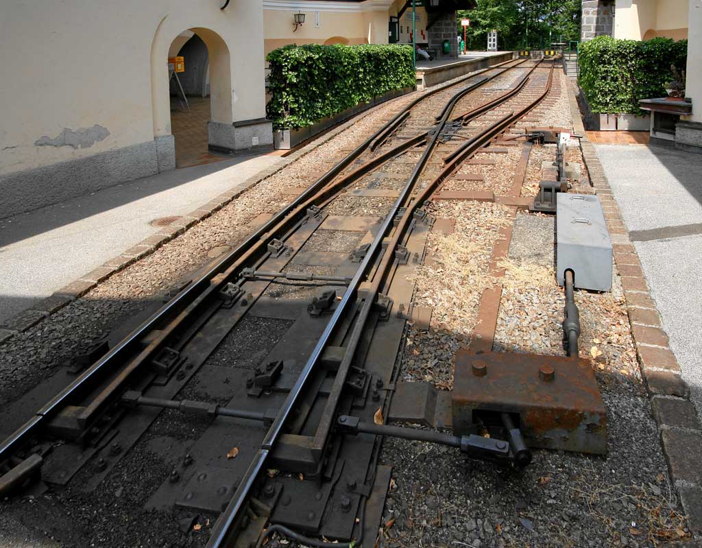 This turnout, similar to one I posted last week is another example of an interesting design. No switch points, it works similar to a stub switch except this has a rotating section of rail instead of a frog. The entire unit is mechanically driven to move the bridle and the frog rail in unison. Interesting that even with no frog point there is still guard rails being used.