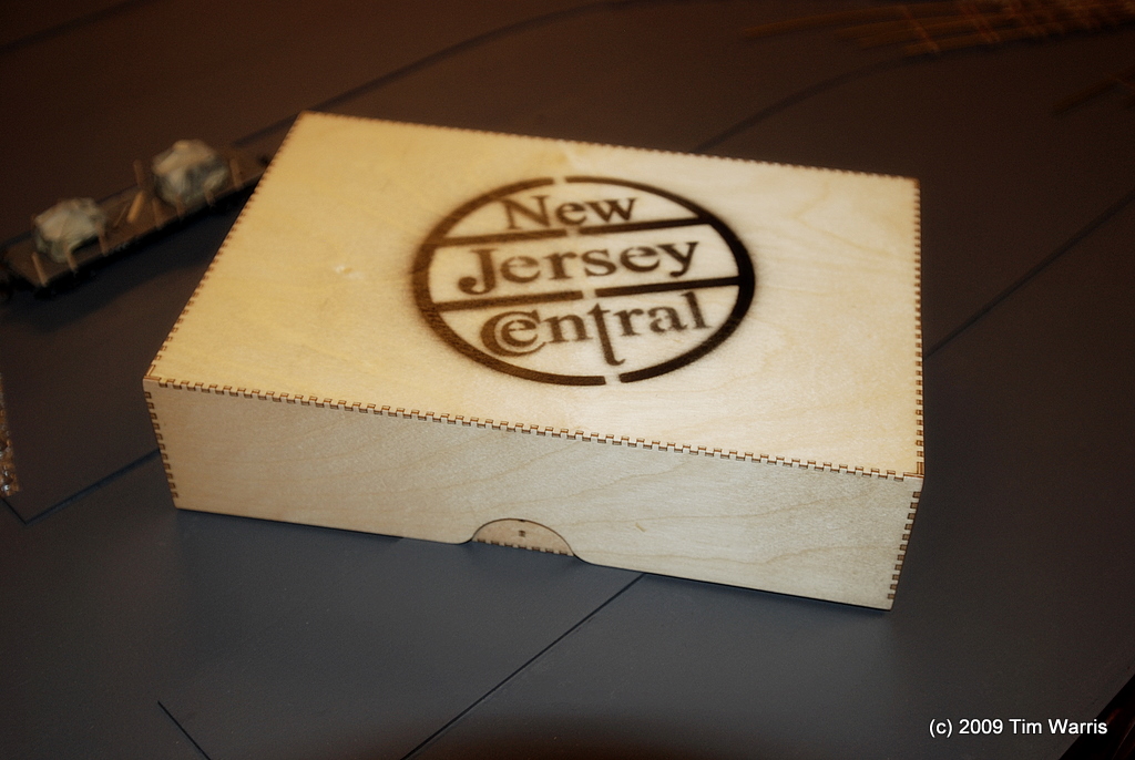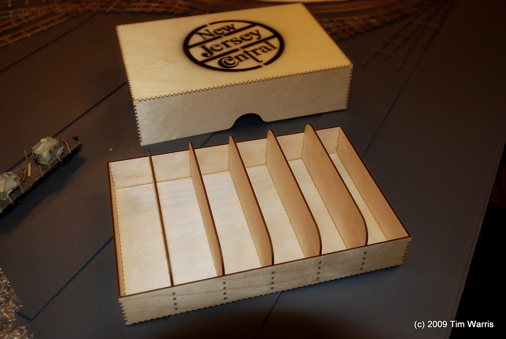 After seeing what Rich Chrysler was using to transport his very detailed models I thought I would use something similer. What Rich uses is a Plano plastic box that seems to have been designed to fit a 40′ train car nicely (I think they are designed for fishing tackle and crafty trinkets). Unfortunatly I could not find one, so I figured why not make on out of wood with the laser.