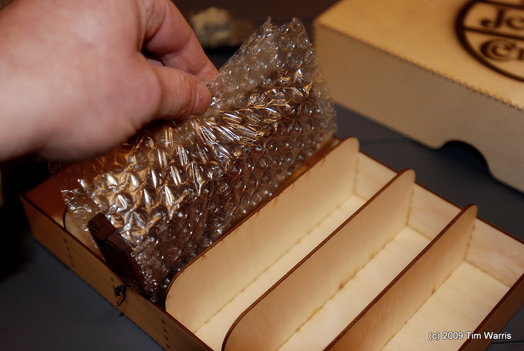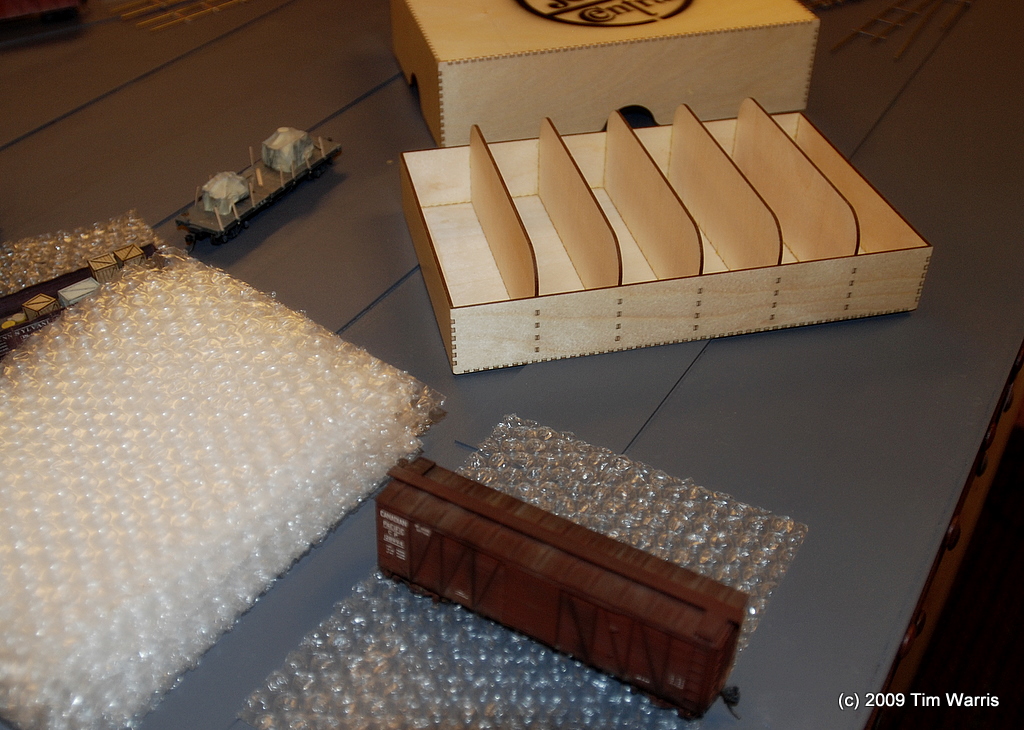 Each section is the right size for a 40′ car and bubble wrap. What Rich does is create a little cradle out of a sheet of bubble wrap. This can be used to lift the car in and out of the box.