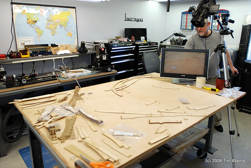 Here we are setting up for the PlatForm video shoot. PlatForms are a new product line we released this past summer. They are used for 1:1 track planning and are laser cut track “templates” that match every possible turnout and switch size, plus a large library of straight, curved, easements, flexible and variable length pieces. About 5000 parts in all!